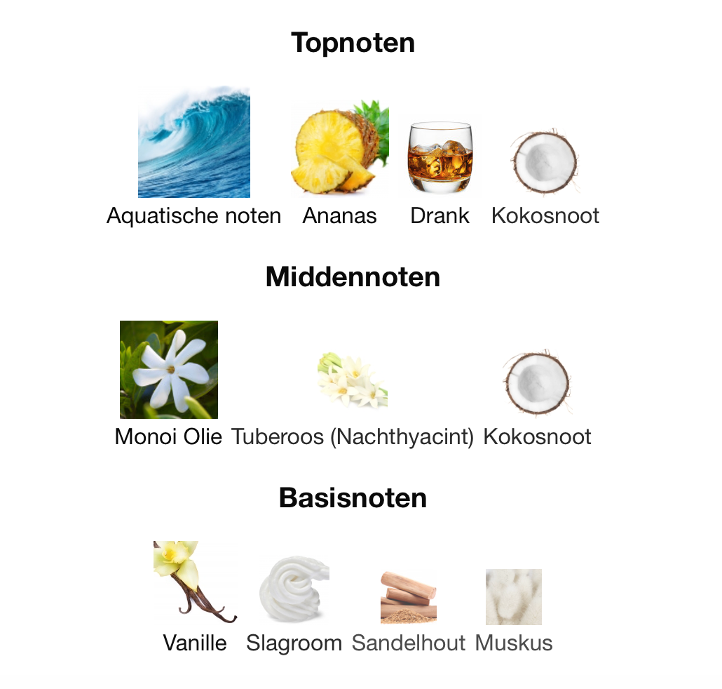 Tropical liquor, juicy pineapple, and smooth coconut melt into tuberose and Monoi, resting on a warm, dreamy base of vanilla, sandalwood, and skin-soft musk.