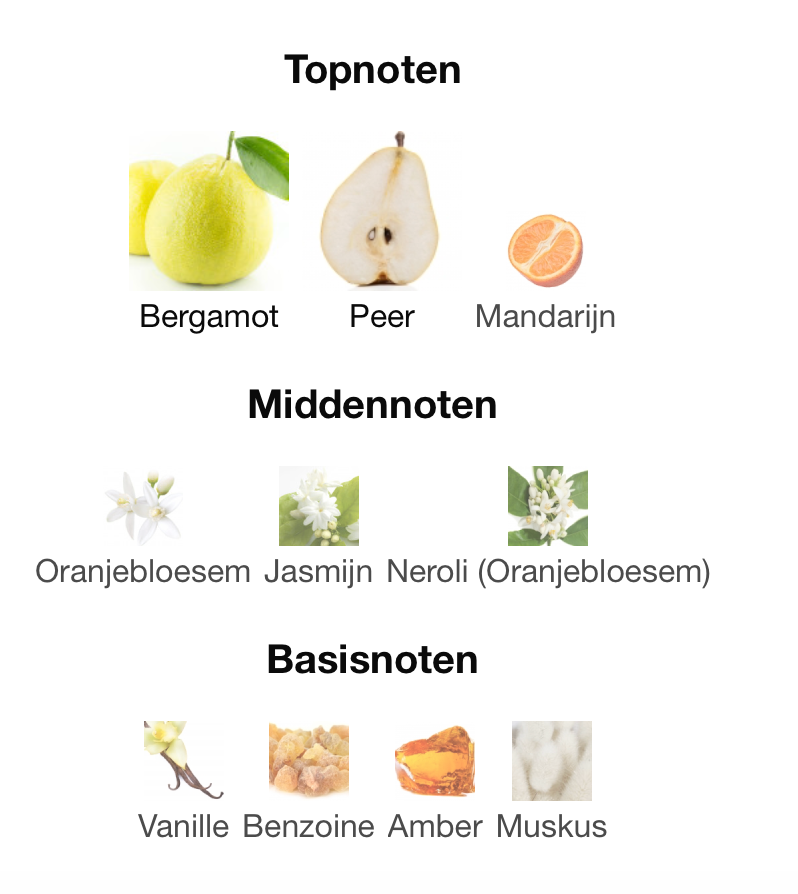 The fragrance opens with a lively burst of bergamot, tangerine, and juicy pear, creating an energizing and refreshing first impression. As it unfolds, the heart reveals a delicate bouquet of orange blossom, jasmine, and neroli, exuding timeless floral elegance. Finally, the base settles into a creamy blend of vanilla, benzoin, musk, and amber, leaving a warm, sensual, and long-lasting trail.
